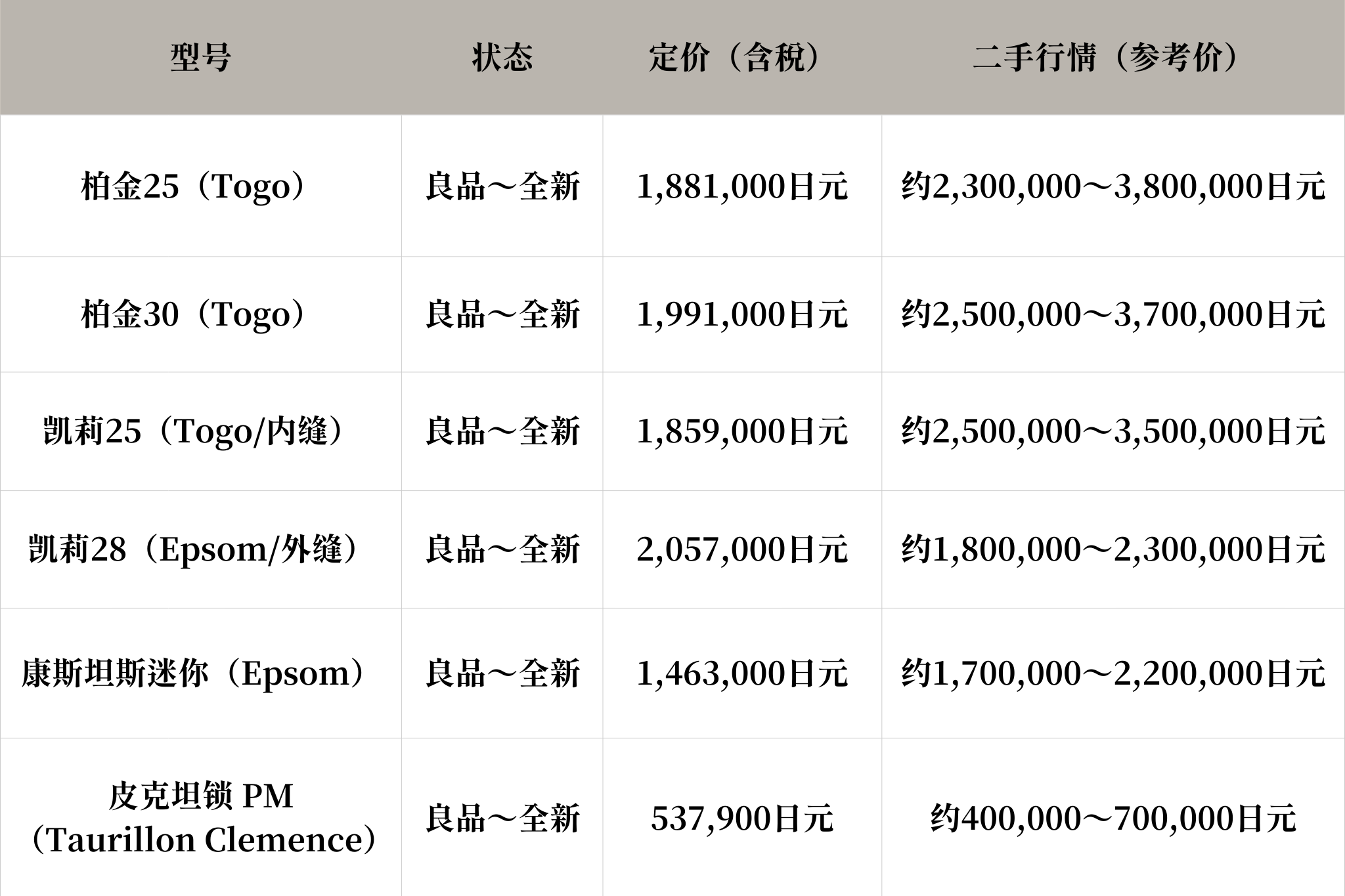 由于能以官方定价买到爱马仕包的机会有限,二手及转售市场一直保持着极高的需求。部分型号和状态良好的包包甚至会以高于官方定价的价格成交。以下整理主要款式的二手价格区间: