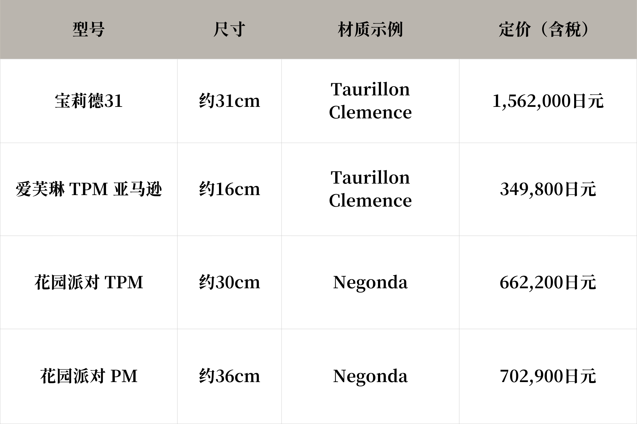※ 价格随材质和颜色变动。异兽皮如鳄鱼皮等价格有时超过500万日元,是极具资产价值的人气款。