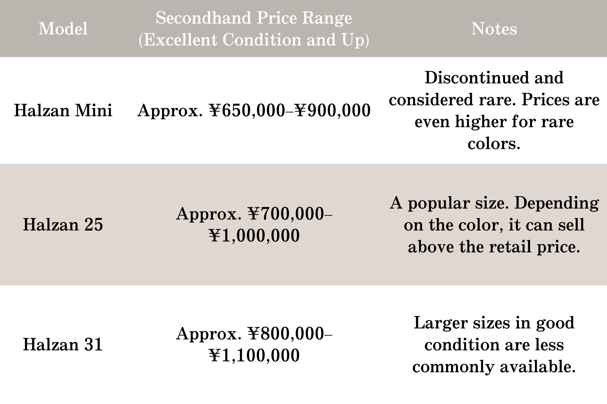 The Halzan maintains a consistent resale value in the secondhand market due to its limited availability. In particular, popular sizes and colors, as well as pieces in excellent condition, tend to fetch higher appraisals.