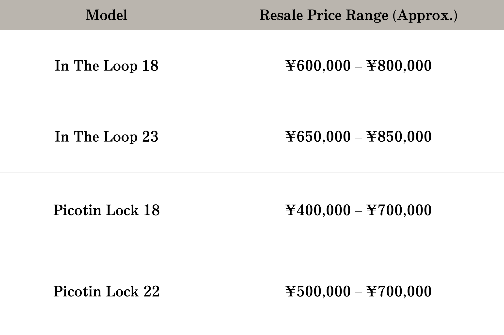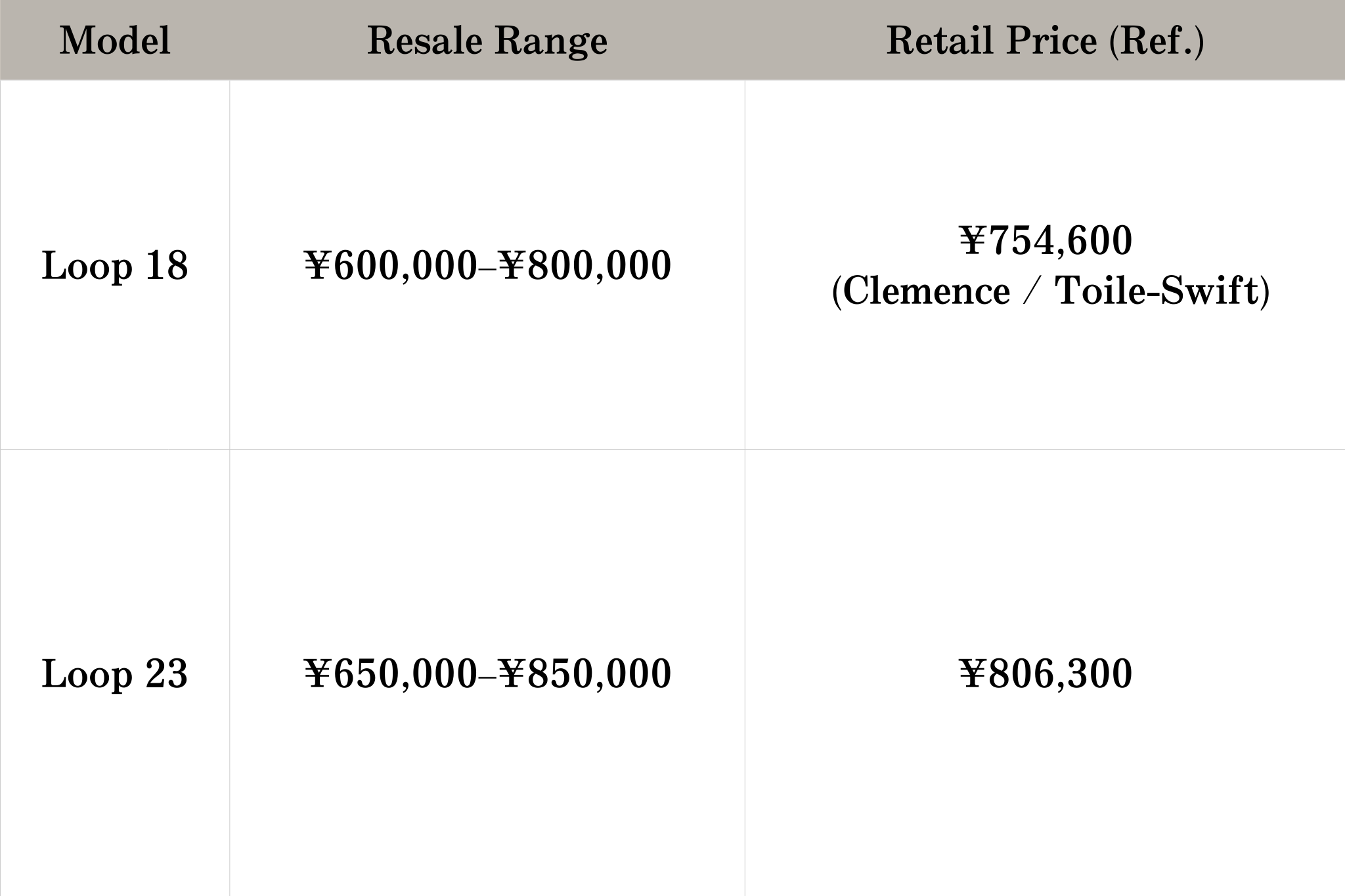 In The Loop 18 generally sells for ¥600,000 to ¥800,000, and the 23 for ¥650,000 to ¥850,000.