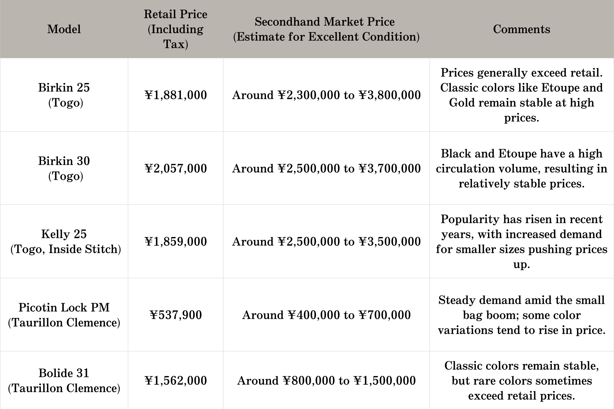 One appeal of the secondhand market is that you can compare prices with the retail price. However, popular models sometimes sell for more than the retail price even on the secondhand market. When purchasing, it’s crucial to be aware of the current reference prices at the time of the article update and understand the difference from the retail price. In particular, staple colors like Etoupe and Gold have high demand and relatively stable market prices.