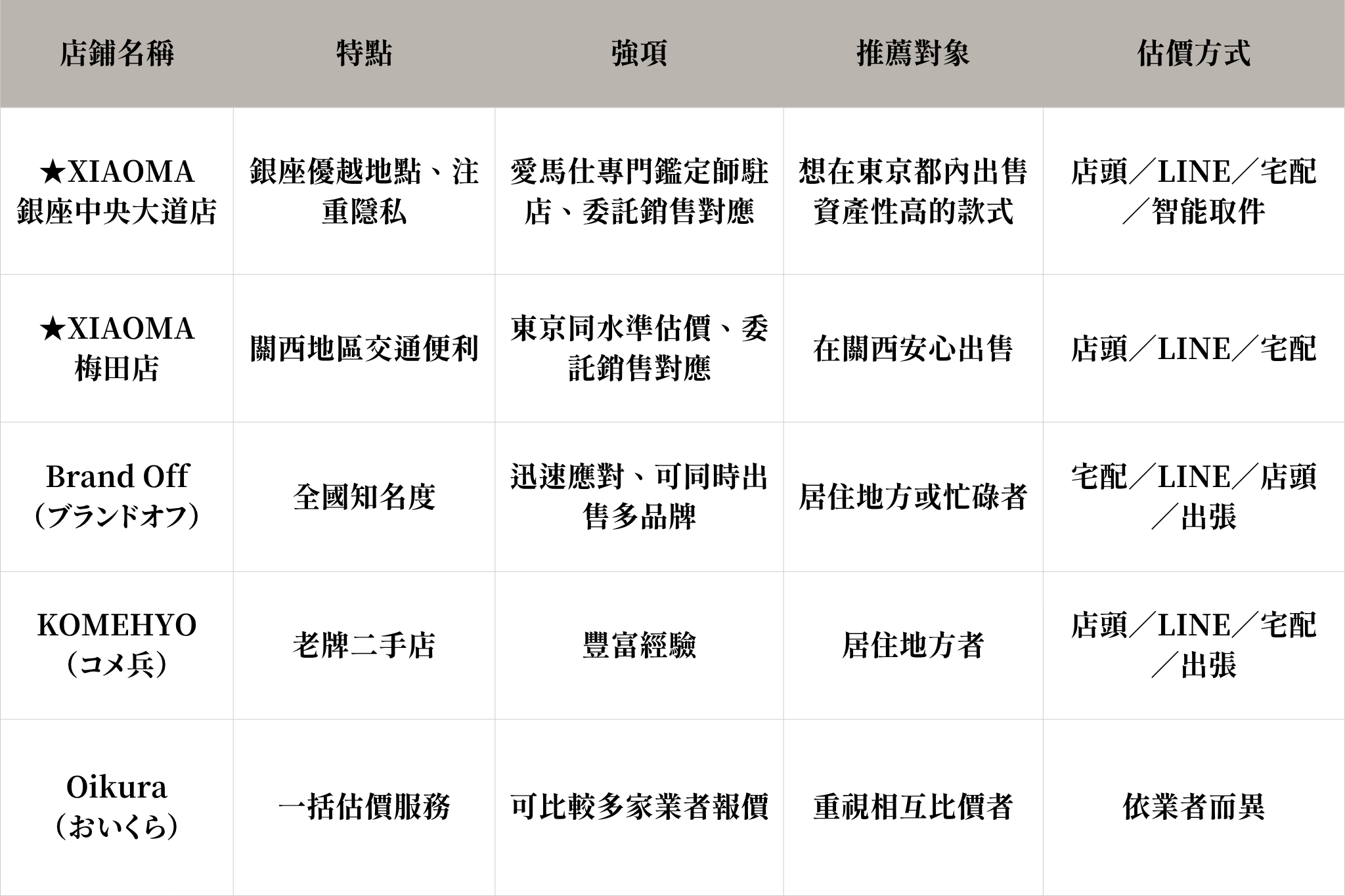 比對各店特色並選擇合適的估價方式很重要。特別是想「也想選擇委託銷售」、「想在銀座或梅田安心諮詢」的人,推薦使用XIAOMA的實體店鋪。