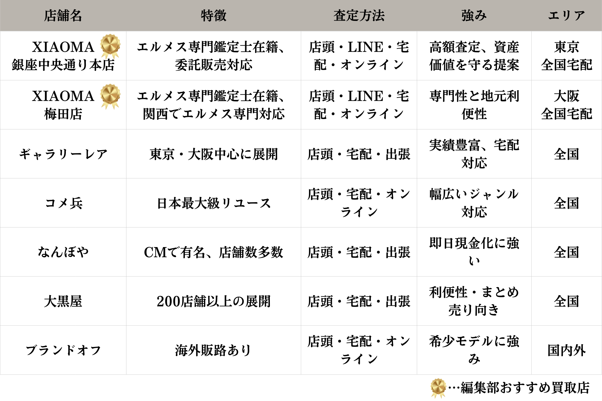 本記事では、エルメスを高く・安心して売却したい方のために、XIAOMA Topics編集部がおすすめする買取店7選を徹底比較。さらに「高く売れるエルメスの条件」や「失敗しない店舗選びの基準」「よくある質問」までわかりやすく解説します。