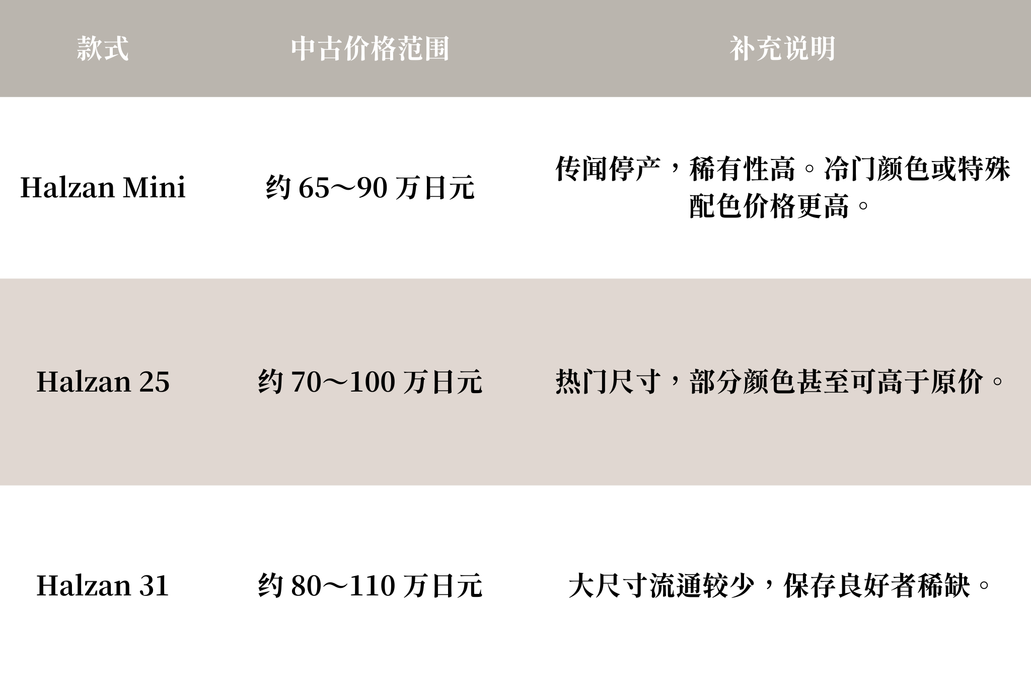 曾有一度传出 Halzan Mini 会因 Halzan 25 的推出而停产,但目前在爱马仕的官网(参考链接)仍可看到其商品页面,因此推测尚未完全停售。