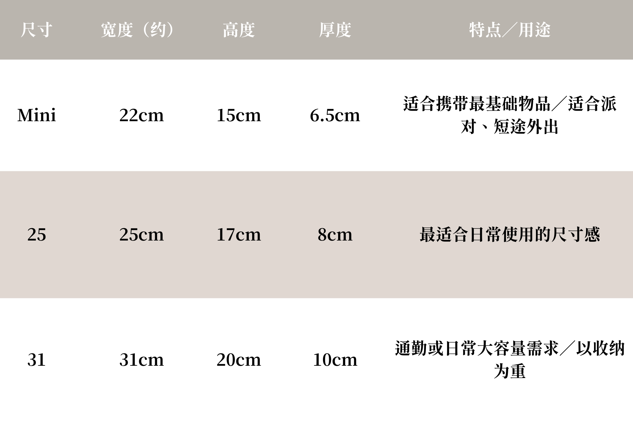 这里将比较迷你款、25号和31号各尺寸特点,帮助你选择适合自己生活方式的款式。