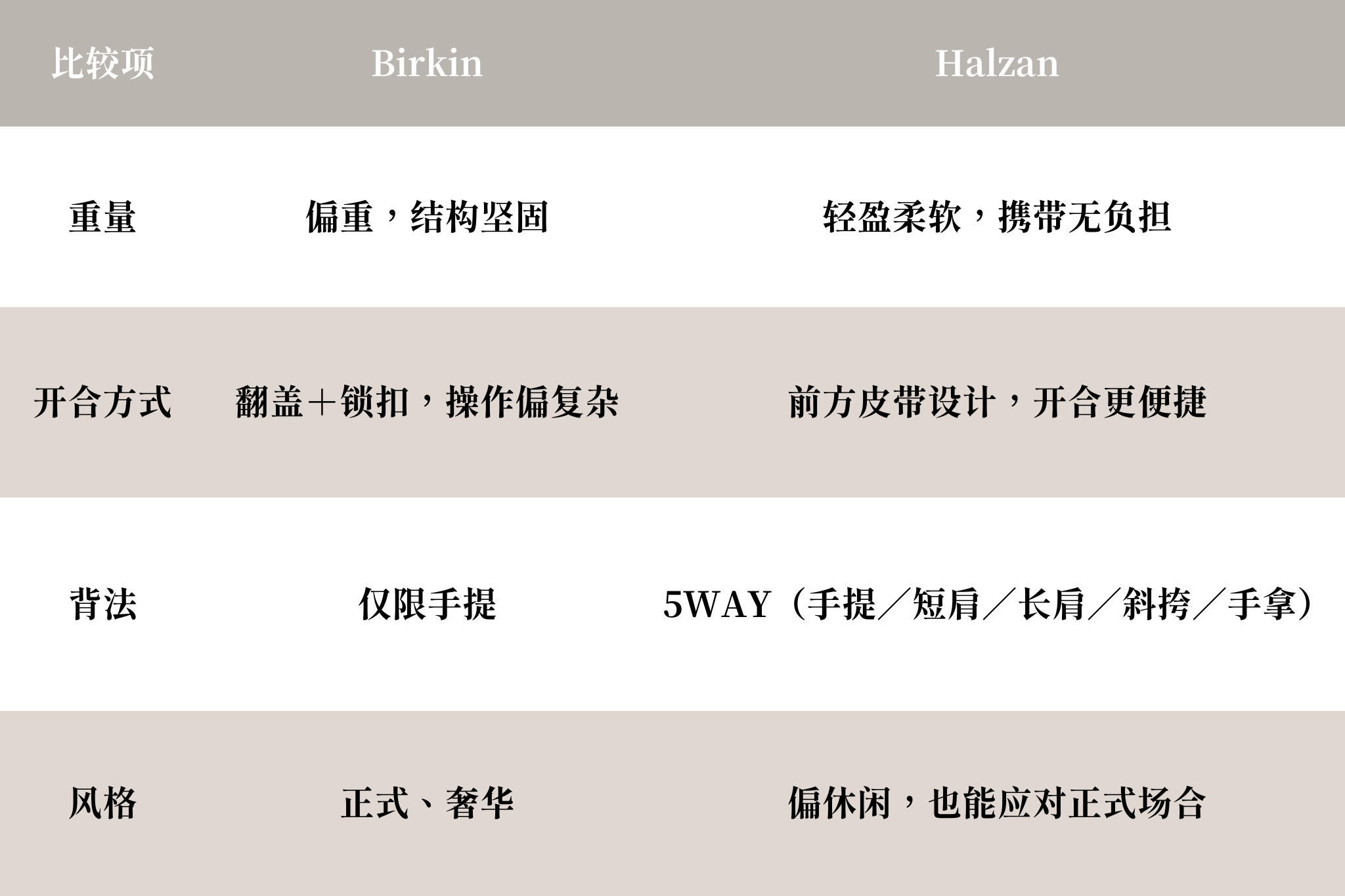 Halzan 与 Birkin、Picotin、Lindy 等其他热门包款有什么不同?我们从实用性、设计感、价格等方面进行横向对比: