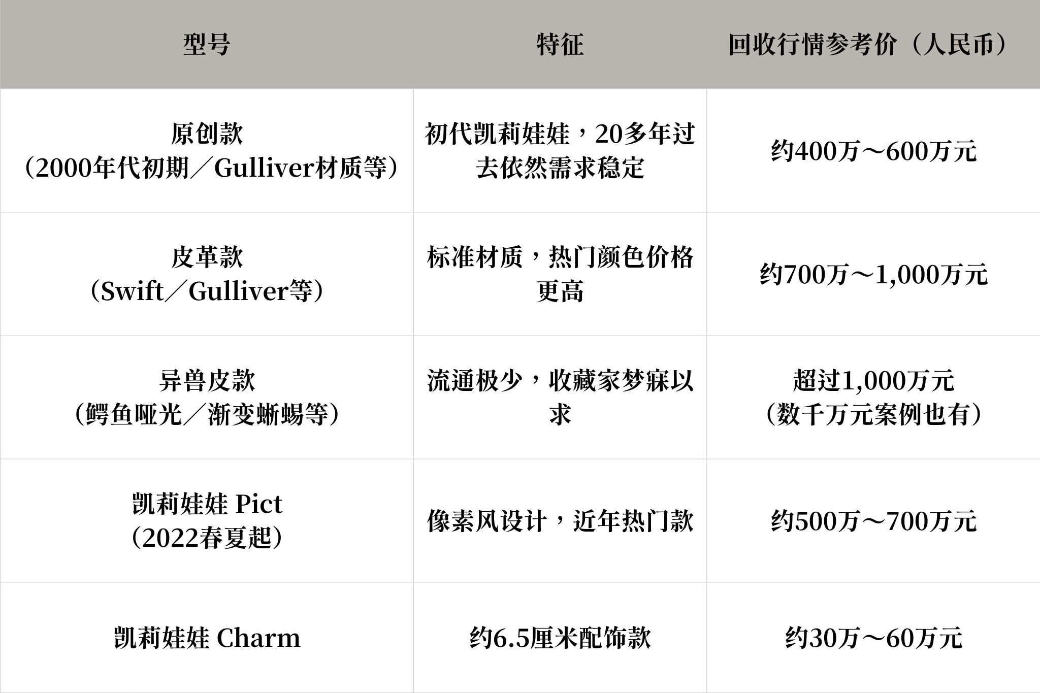 凯莉娃娃因其趣味设计和高稀有性,在爱马仕系列中极具特殊地位。原创、Pict、异兽皮款乃至Charm均高价交易,回收市场普遍高于定价。