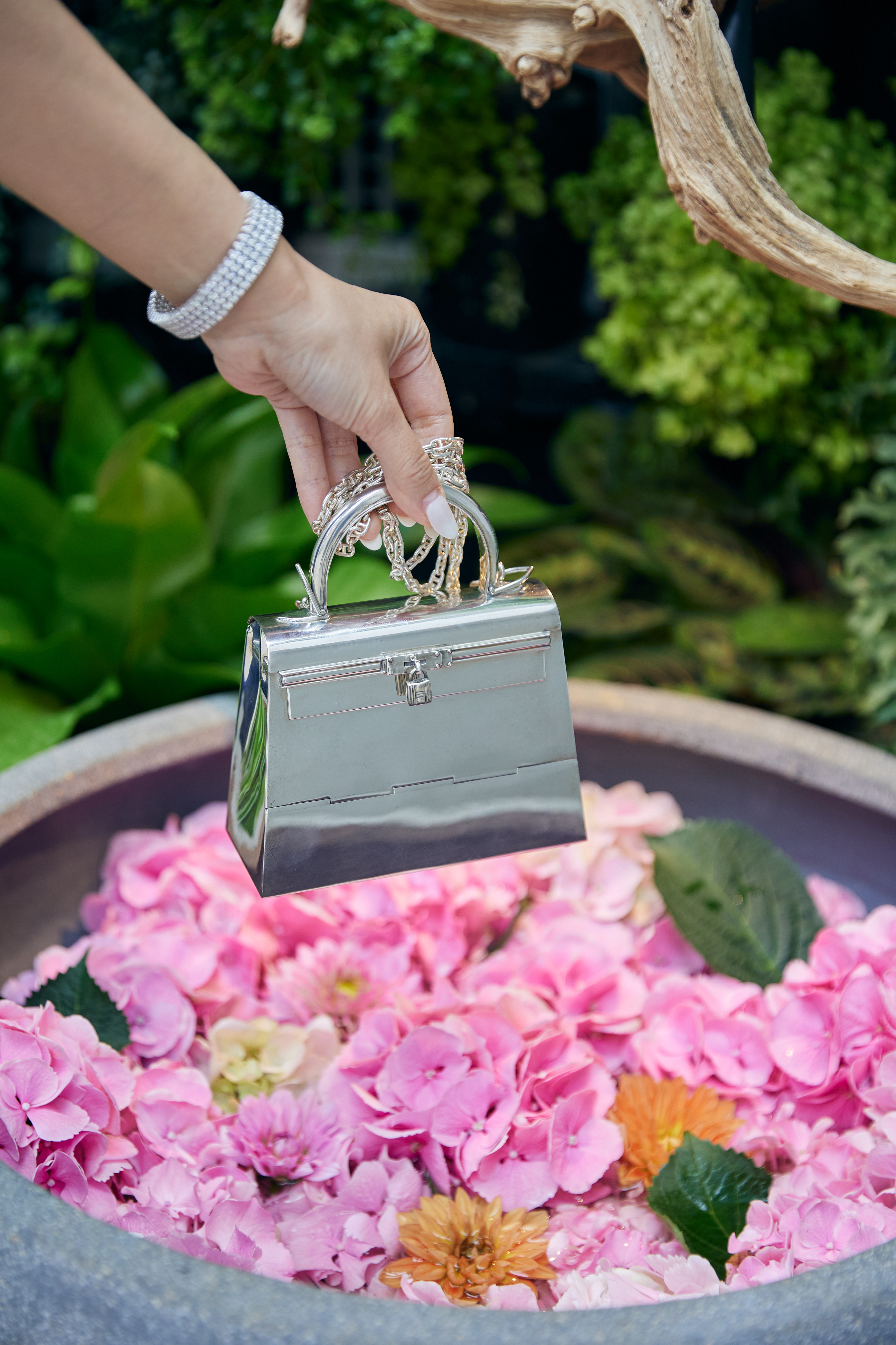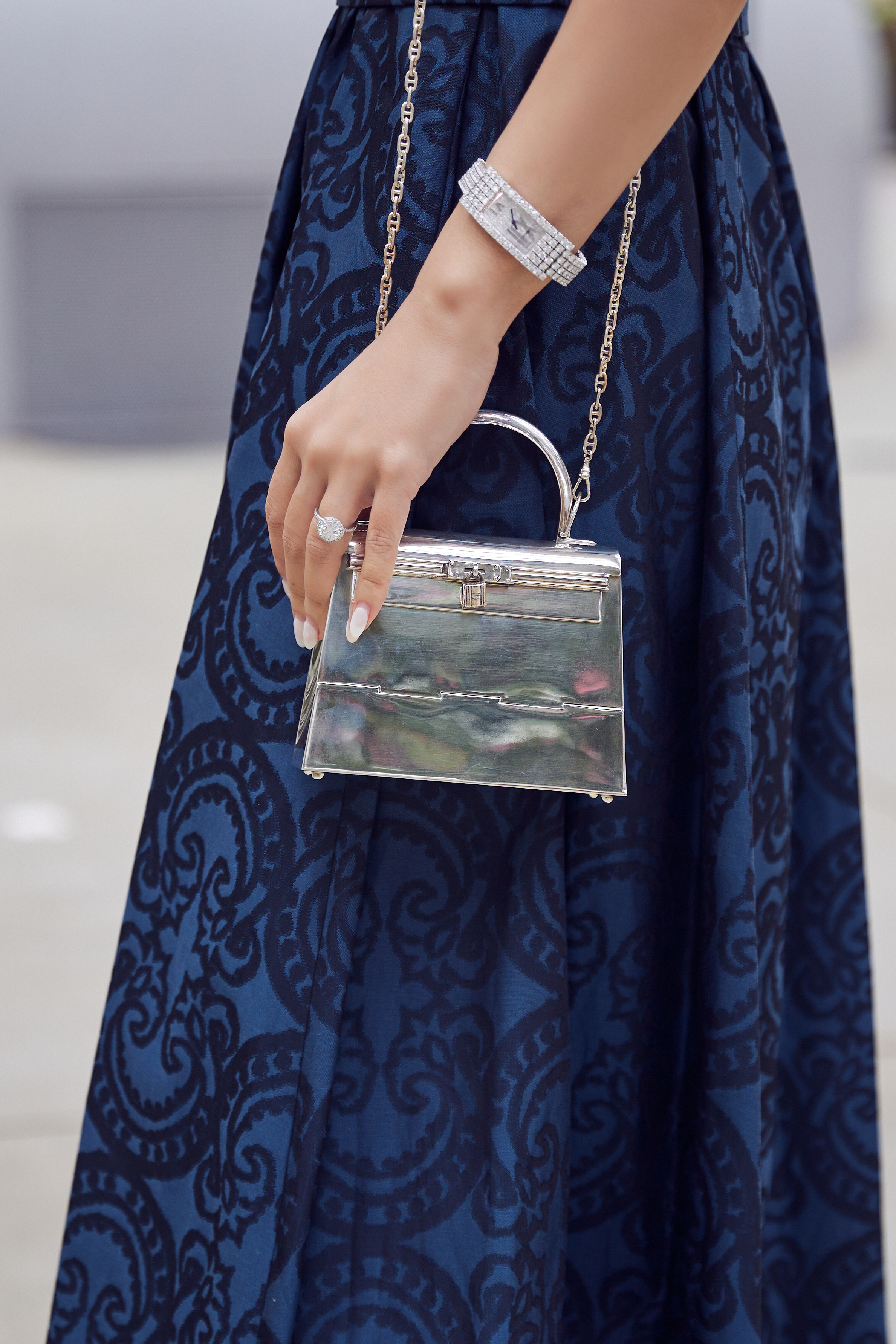 At first glance, it reads like an antique decorative object rather than a handbag. The craftsmanship is extraordinarily precise: every detail — from the trapezoidal body and rolled top handle to the signature turn-lock, sangles, and padlock — is rendered with remarkable fidelity. The aesthetic recalls a vintage silver vanity case, refined and quietly opulent.